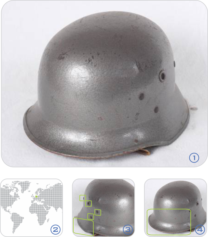 Observaciones: 1 - Imagen más representativa 2- Casco de bomberos de Belgica. 3 - Refuerzo estructural acoplado, fijado por medio de remache. Pares de remaches para anclaje de cintas que sujetan casco a la cabeza, por debajo del mentón. Pares de remaches para fijar suspensor interno. 4- Visera discontinua con mayor longitud en el frente y parte posterior que en los laterales.